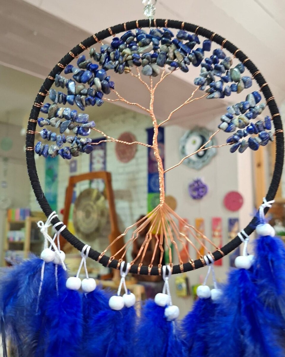 Atrapasueños decorado con lapislázuli, una piedra tradicionalmente asociada con la sabiduría, la verdad interior y la claridad mental.
